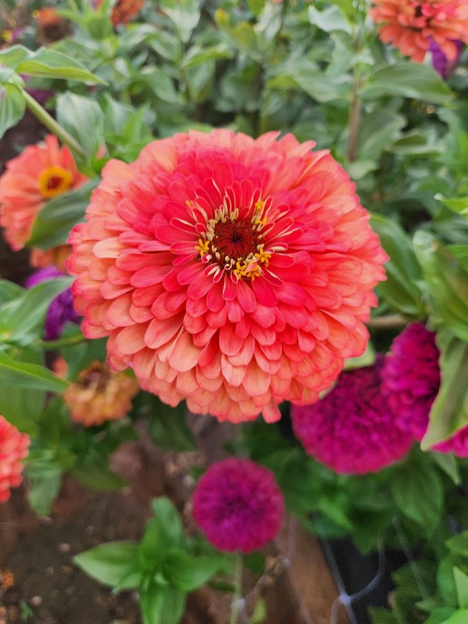 - Zinnias grow well with other brightly colored flowers. We love to grow them in front of our sunflowers, hollyhocks, and other tall blooming flowers. Shop all our flowers here. We also plant zinnia among squash and pumpkin to help bring pollinators to the garden.